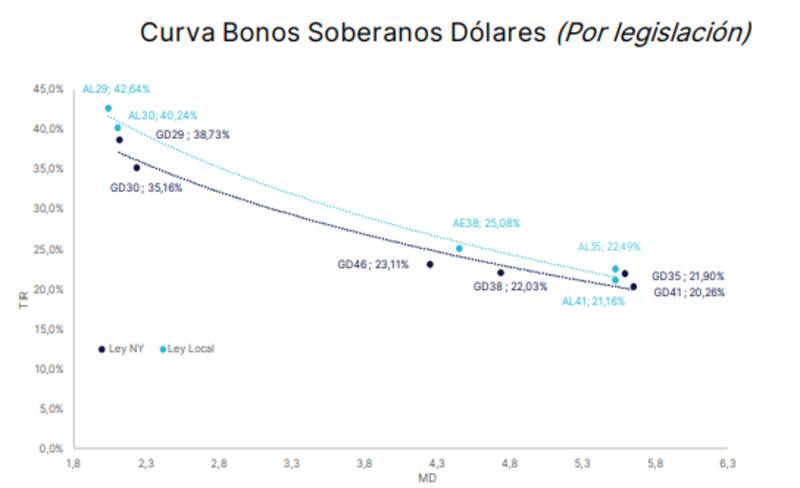 "Vemos una oportunidad para vender GD30 y comprar AL30. Si bien reconocemos que la legislación Nueva York representa un mayor valor, creemos que el spread por legislación en 10% luce elevado. Adicionalmente, en la reestructuración pasada de 2020 no se realizó un tratamiento diferencial por legislación, lo cual es un antecedente favorable", detallaron desde Banco Galicia.