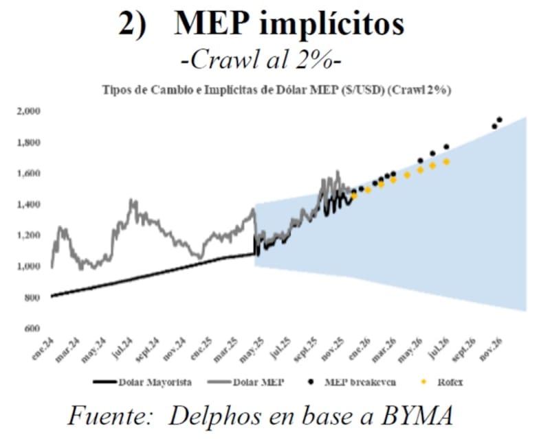 “Los inversores parecen descontar una banda superior corriendo al crawling del 2,0% mensual y un tipo de cambio real estabilizado en torno a los $1500. Todas las implícitas de tipo de cambio se ubican significativamente por sobre la banda cambiaria proyectada al ritmo de crecimiento actual, lo que quiere decir que el mercado desconfía del régimen actual. Más bien, los MEPs implícitos se condicen con un ritmo de crecimiento del 2%, y aun así ubicándose muy próximos a este umbral superior hipotético”, dijeron desde la consultora.