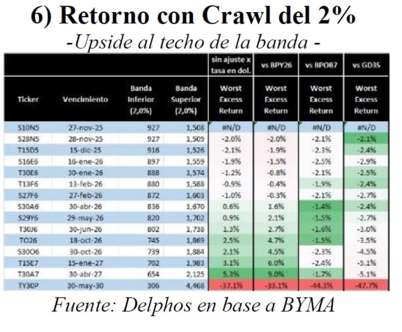 “Incluso de convalidarse un crawling al 2% de la banda superior, el riesgo de pérdida es entre bajo y nulo y las letras largas ofrecerían una oportunidad atractiva de carry apoyada también en un probable descenso de la inflación no descontado en bonos”, comentaron desde Delphos.