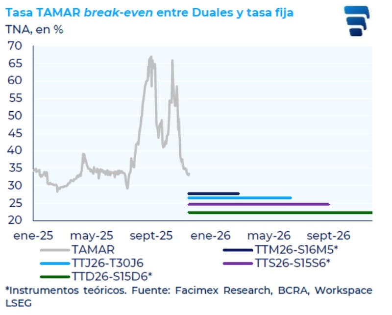 Consideramos que los bonos Duales, junto con los CER, siguen siendo las alternativas más atractivas para capturar retornos más elevados. La TAMAR podría estacionarse en los niveles actuales del 33% TNA, favoreciendo el rendimiento relativo de los bonos Duales. Priorizamos el dual a marzo 2026 (TTM26 con TAMAR +0,3%) y el dual a junio 2026 (TTJ26 con TAMAR +0,8%), cuyas TAMAR breakeven se ubican en 19,9% y 27,3%, respectivamente”, detallaron desde Cohen.