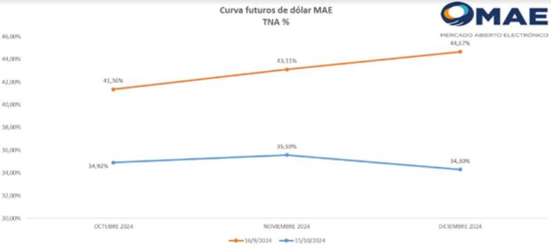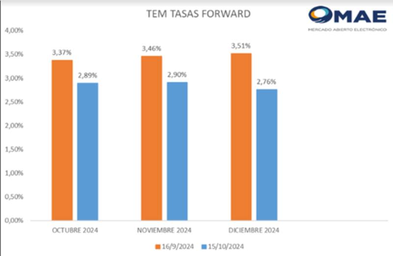 Las tasas de dólar Futuro en MAE comprimieron a la baja en el último mes. Ahora el mercado ve un crawling de 2,89% (TEM) para octubre, debajo del 3,37% (TEM) que se esperaba hace un mes.