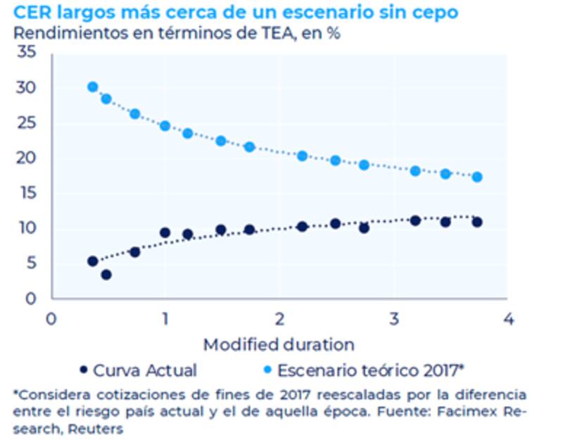 De hecho, cuando se analiza la curva CER y se la compara con la salida del cepo en la era Macri, las tasas más largas de la curva ya se ubican en niveles similares a los que operaba en aquel momento, anticipando una cercanía en el levantamiento de los controles cambiarios.