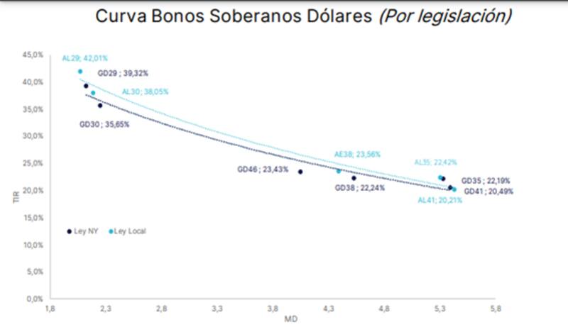 Por otro lado, remarcó que "si bien los bonos con vencimiento en 2030 comienzan a amortizar en breve, los binomos GD35/AL35 y GD41/AL41 brindan una mayor protección vía sus bajas paridades a dificultades en el proceso de ajuste de la economía", dijo.
