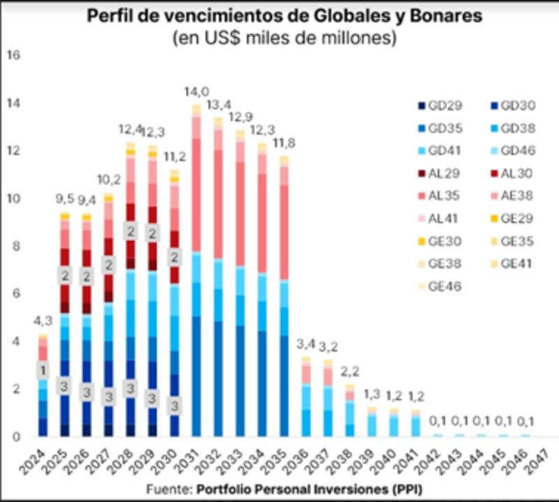 Luego, entre 2028 y 2030 vencen u$s 12.400 promedio anual y desde 2031 hasta 2035 vencen entre u$s 11.800 y u$s 14.000 millones por año.