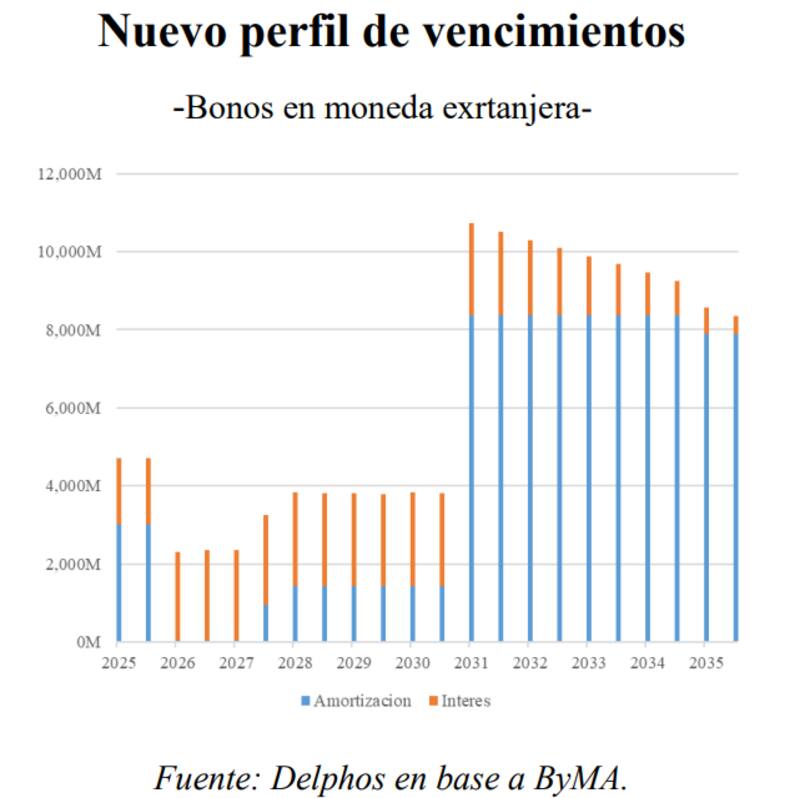 "Los bonos más cortos son los que concentran mayores flujos en los próximos años porque ya están pagando capital, por lo que tiene sentido que estos sean los principales candidatos a ser canjeados. Los bonos que vencen en 2029 y 2030, al tener cupones bajos (1% y 0,75%), podrían dar margen para mejorar sus condiciones en un canje", detalla.