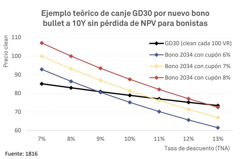 Calcula que si se modificara la estructura de estos dos bonos, colocando un período de gracia de cinco años, asumiendo los dos próximos pagos y aumentando el cupón al 5% fijo, el equilibrio entre el nuevo bono y los actuales se daría con una suba de 10% en los precios. Es decir, los precios de canje serían u$s 84 en los 2029 y u$s 76 en los 2030.