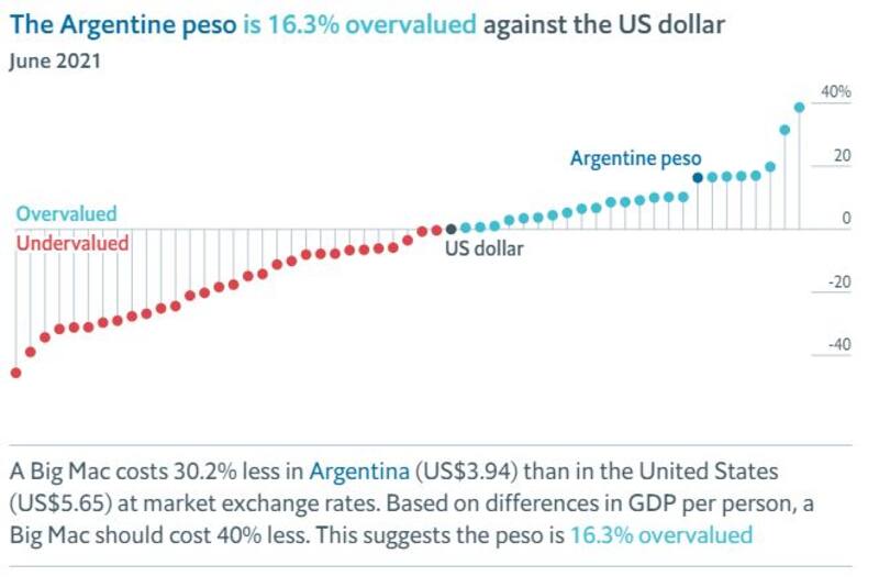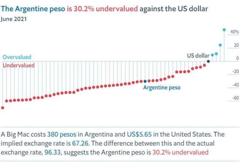 De acuerdo con los números de The Economist el peso argentino está subvaluado un 30,2% contra el dólar. La publicación destaca que el Big Mac cuesta $ 380, contra US$ 6,65 que sale en los Estados Unidos. Así, la tasa de cambio implícita es de $ 67,26 por dólar, contra los $96,33 por dólar que se ve en las pizarras de las casas de cambio argentinas.