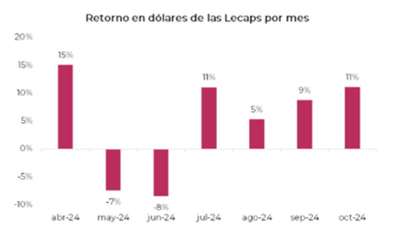 Según los analistas de Cohen, las Lecap rindieron 11% en octubre en dólares, un 9% en septiembre en moneda dura, 5% en agosto y 11% en julio.