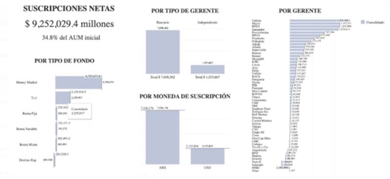 En total, las suscripciones netas en los FCI en lo que va del año alcanzan los $9,25 billones, por lo que tanto los T+0 como los T+1 agruparon la totalidad de los pesos que fueron a la industria.