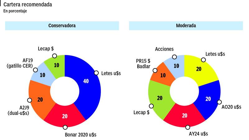 Ignacio Leiva, vicepresidente de Leiva Bursátil, junto con el equipo de Research de la compañía consideran que en este momento resulta clave encontrar un equilibrio entre la rentabilidad y el riesgo y por ello propone una cartera que apunta a un 80% en dólares y 20% en pesos. Para aquellos que busquen mayor retorno, recomienda una cartera de 60% en dólares y 40% en pesos.