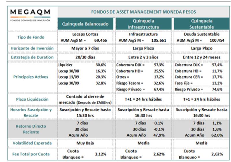 "Para quienes están ingresando al blanqueo con pesos, hoy estamos haciendo foco en 3 productos dentro del abanico de opciones que tiene MegaQM. Tenemos una mirada donde de corto plazo priorizamos las opciones de tasa fija. Pero cuando el inversor requiere una posición de largo plazo como puede ser la del blanqueo, buscamos complementar el posicionamiento de corto con fondos que ofrezcan un alto grado de cobertura", explicaron.