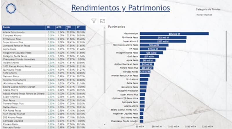 Como estimativo de los rendimientos, según datos de Criteria, el fondo money market de Allaria, "Allaria Estructurado", muestra una ganancia en lo que va del año del 23,2%, seguido por Compass Ahorro y ST Retorno Total que ganan 23,5% y 21,6% respectivamente.
