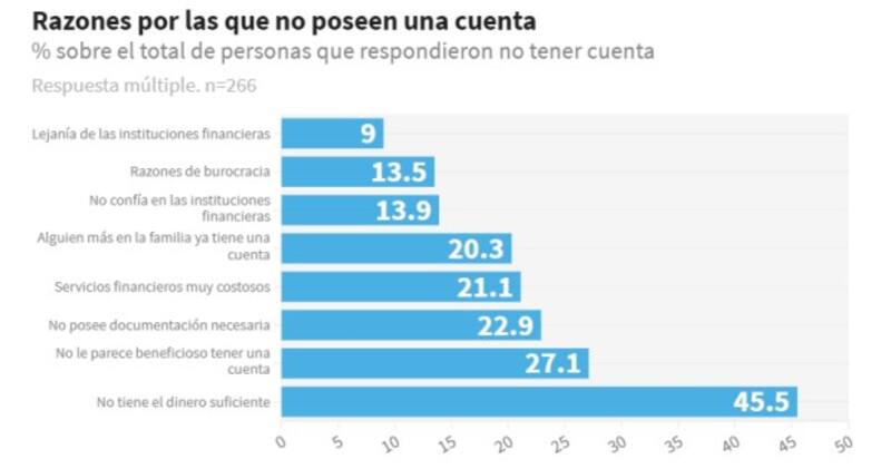 Entre quienes no cuentan con una cuenta bancaria, las principales razones esgrimidas fueron: falta de dinero (45%), falta de incentivos (27%), los altos costos (21%) y la falta de documentación necesaria (23%). "Este último punto refleja que la verdadera barrera está en el acceso a la información", advierte el trabajo ya que este último motivo está suplido por normativas como la Cuenta Gratuita Universal de apertura diligenciada.
