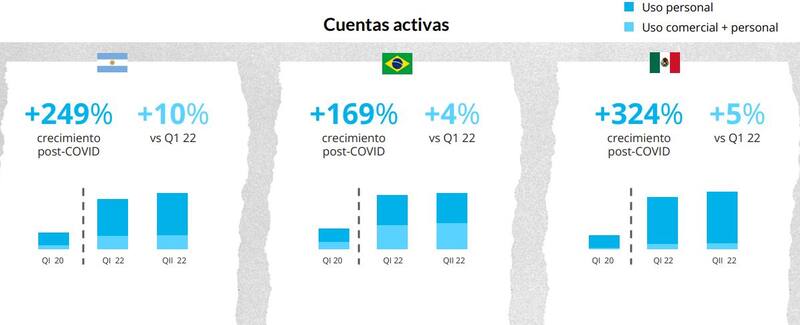 El fuerte crecimiento de cuentas luego de la pandemia es otro de los ítems que resaltó la compañía. El estudio, basado en las tres economías más grandes de América Latina (Brasil, México y Argentina), ubicó a la Argentina en el segundo lugar en crecimiento de cuentas, que registró un alza de casi 250 por ciento.