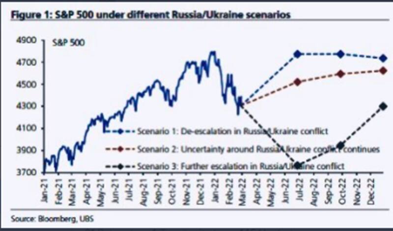En el corto plazo, la clave pasará por la dinámica que tome la guerra entre Rusia y Ucrania. El banco de inversión UBS plantea tres escenarios posibles en función del futuro del conflicto bélico.