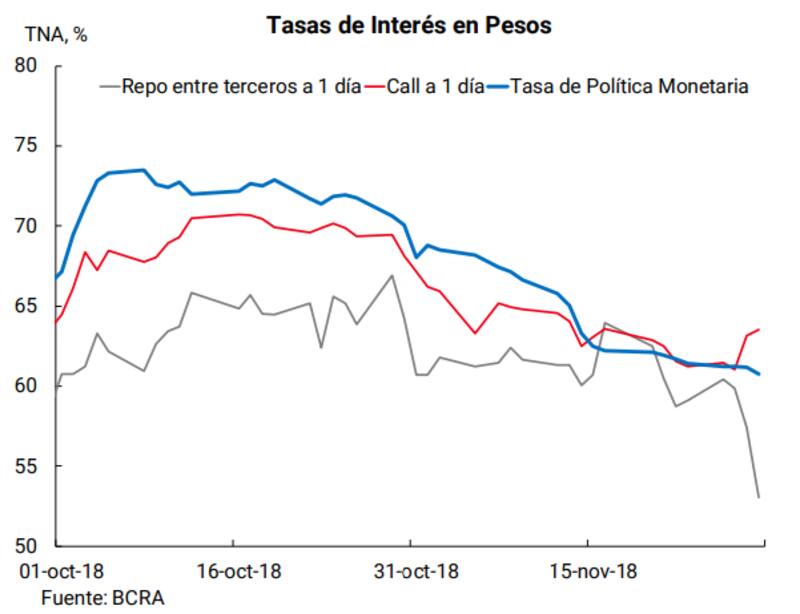 La tasa promedio de las Leliq durante noviembre, según el BCRA, fue de 60,75%. Después del pico de 73% que tocó en la primera semana de octubre, en noviembre se consolidó una tendencia a la baja que se mantuvo todo el mes.