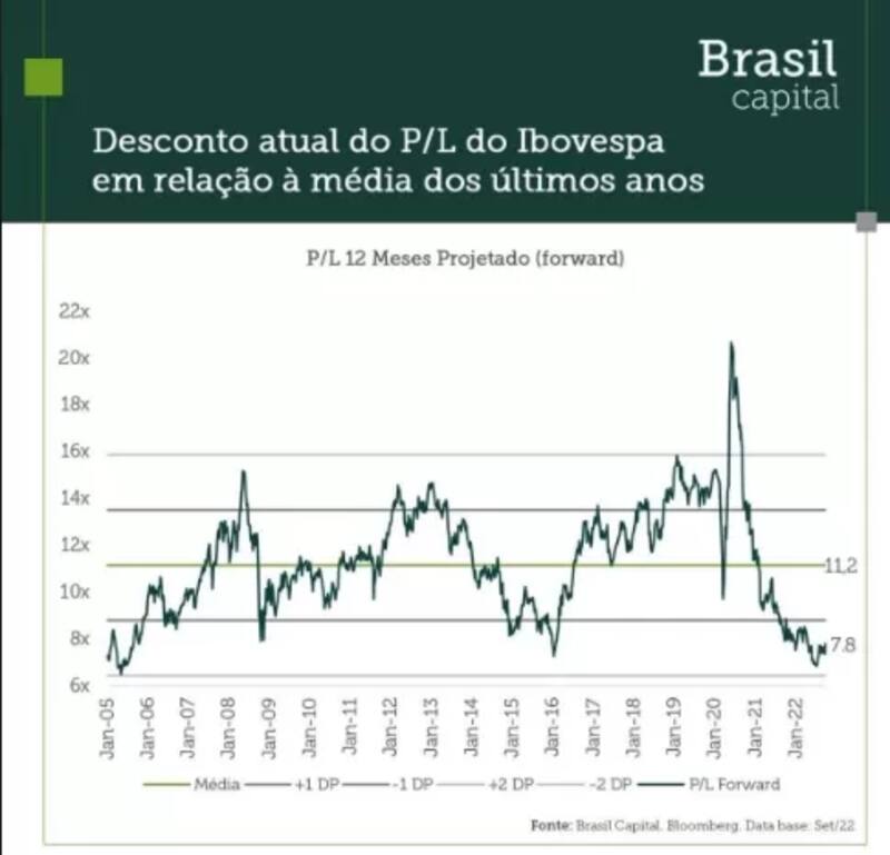 El valor libros de las acciones de Brasil se ubican casi dos desvíos debajo de su promedio de largo plazo y cerca de niveles vistos en 2016 e incluso 2005.