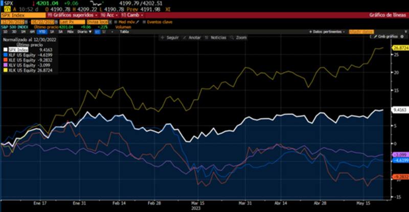 En cambio, el sector tecnológico muestra avances de 27% en lo que va del año. Las acciones de crecimiento a largo plazo, incluidas dentro del índice ARK Innovation (ARKK), ganan 27% en 2023, mientras que consumo discrecional sube 17%.