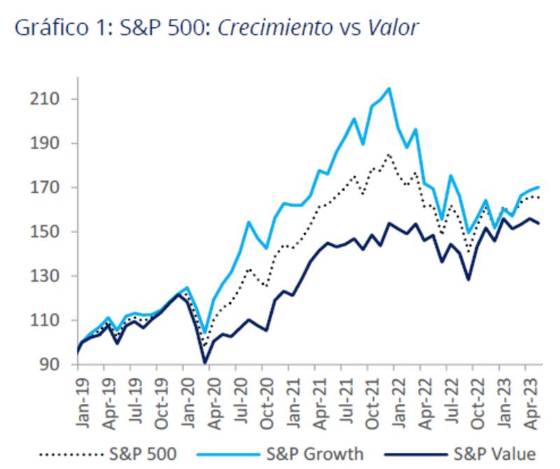 Con una visión similar, los analistas de Balanz consideran que el buen desempeño de las acciones de crecimiento está explicado por diferentes factores entre los que se destacan la convergencia después de un muy mal desempeño en 2022 producto de las subas en las tasas de interés, junto con la resiliencia y balances corporativos que sorprendieron al alza este año.