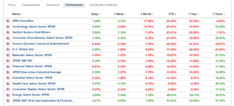 El índice de acciones de crecimiento a largo plazo (ARKK) muestra una baja del 54% en lo que va de 2022. Le sigue el sector tecnológico (XLK) que baja 23,6%, el sector de mineras (23%), consumo direccional y el de hotelería y ocio (21% de baja en promedio.