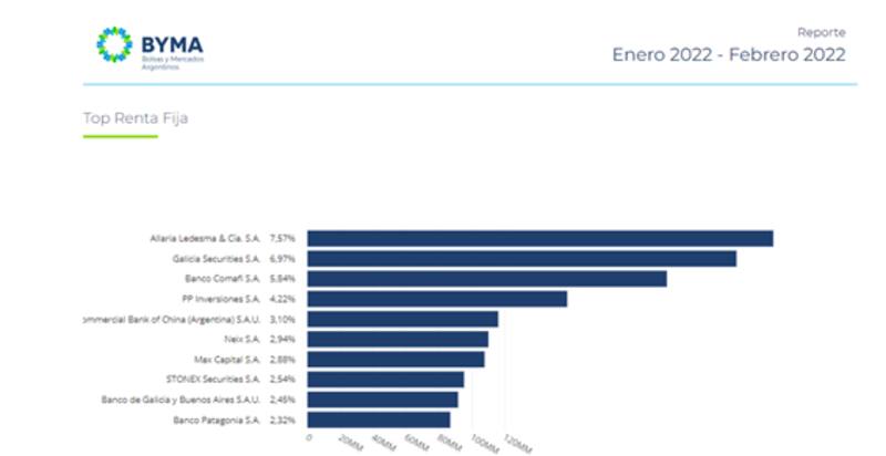 Dentro del ranking de BYMA en instrumentos de renta fija, Allaria Ledesma lideró el share durante el primer bimestre con el 7,57% del total, seguido por Galicia Securities y Banco Comafi, con el 6.97% y 5,84% respetivamente.