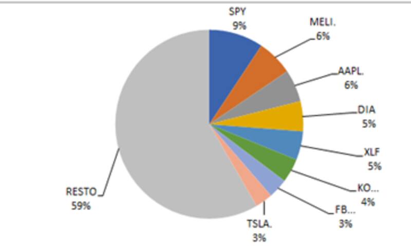 Más abajo se encuentran el ETF del Dow Jones (5%), el ETF del sector financiero (5%), Coca-Cola (4%), Facebook (3%) y Tesla (3%), entre las de mayor share.
