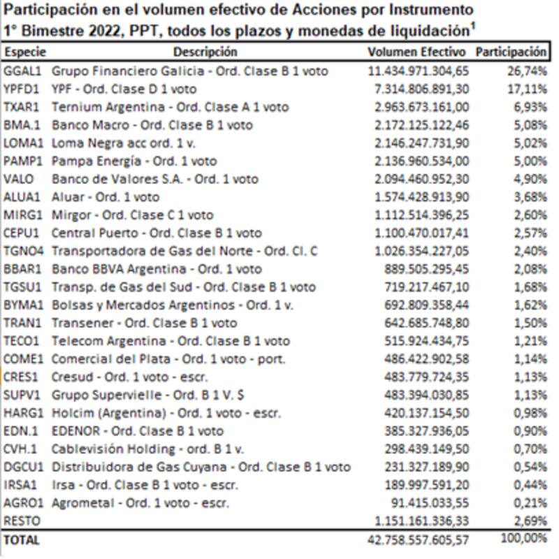 En lo que respecta a acciones locales, Grupo Financiero Galicia e YPF concentran la mayor parte del volumen, con el 26,7% y 17,11% respectivamente durante lo que va del 2022.