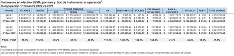También, en el informe de BYMA se destaca el volumen en Obligaciones Negociables, Fideicomisos y Opciones que aumentaron más del 100%, creciendo 119,1%, 133,5% y 134,7% respectivamente, versus los primeros dos meses del 2021.