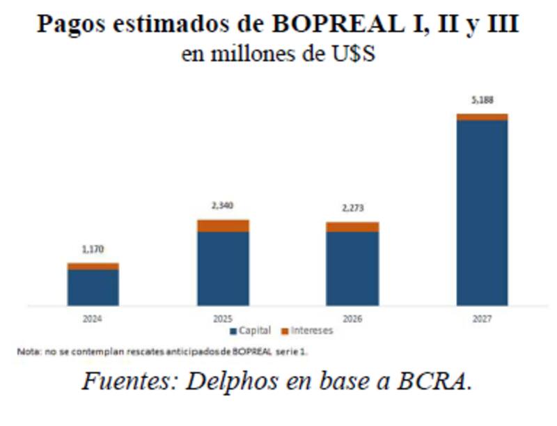 Luego, los vencimientos alcanzarían los u$s 2340 millones en 2025, u$s 2273 millones en 2026 y u$s 5188 millones en 2027 (sin contemplar rescates anticipados de BOPREAL serie 1).