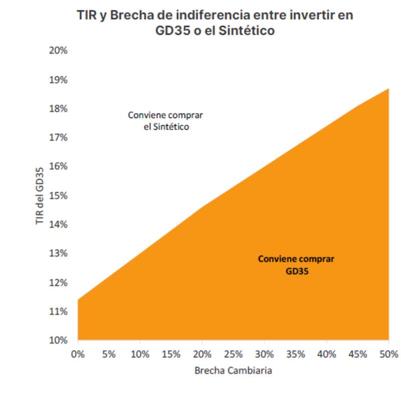 "En un escenario de brecha cercana a 0% y mejora significativa de expectativas que reduce el riesgo país (modelizado con un rendimiento de 12% para el GD35), el sintético de dólar se presenta como la alternativa más rentable. En escenarios donde la brecha se mantiene, pero comprime desde valores actuales, vemos más atractivos los bonos soberanos en dólares, especialmente aquellos de mayor duration", dijeron.