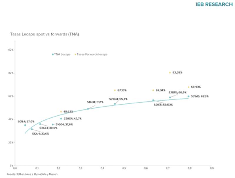Con una visión similar, los analistas de Grupo IEB, explicaron que al observar la dinámica de tasas que pricea la curva de Lecaps a través de las tasas forwards observamos, se observa que a partir de noviembre las tasas suben considerablemente a niveles de 67% TNA que se corresponde a una TEM de 5,6%.