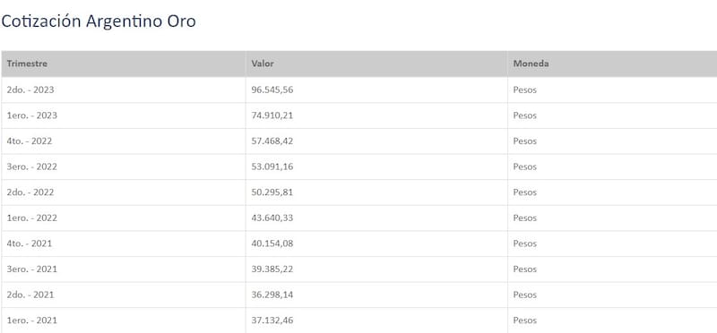 Ahora bien, durante el segundo trimestre del año su valor aumentó a $ 96.545,56 -es decir, tuvo una suba del 28%-. En el mismo período de 2022, un "Argentino Oro" equivalía a $ 50.295,81 -incremento anual cercano 100%-.