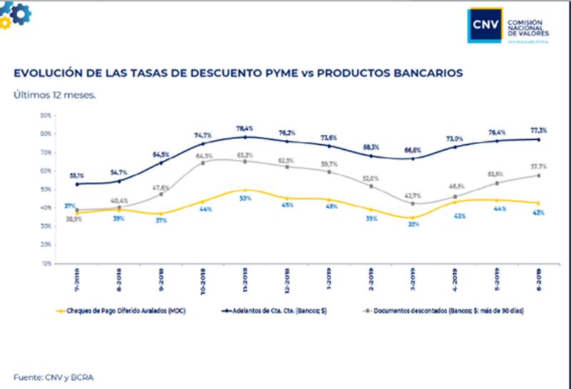 “A pesar de que la tasa a la que se están negociando actualmente dichos instrumentos subió desde los 42,9% para el promedio de las operaciones realizadas durante el mes de junio hasta el 46,5% en julio, sigue siendo una alternativa mucho más atractiva si la comparamos contra las opciones de financiamiento en los Bancos. Hoy los Bancos están cobrando entre 60% y 70% dependiendo la entidad para plazos de hasta 90 días. Y a diferencia del mercado de capitales no realizan operaciones a más de 180 días , subrayó Vallejos.