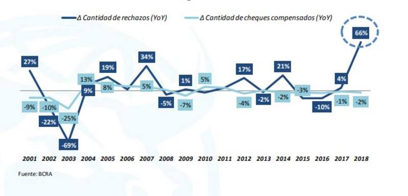 De acuerdo al último informe publicado por el BCRA el porcentaje de cheques rechazados sobre el total compensados alcanzó el 5,2% del total. “Este es un dato muy preocupante si se considera que es el más alto desde 2001 (más alto incluso que en 2002) , destacó el economista Ezequiel Estrada. Además, en 2018, mientras que la cantidad de cheques compensados cayó un 2%, los rechazos en cantidad se incrementaron un 66,2%.