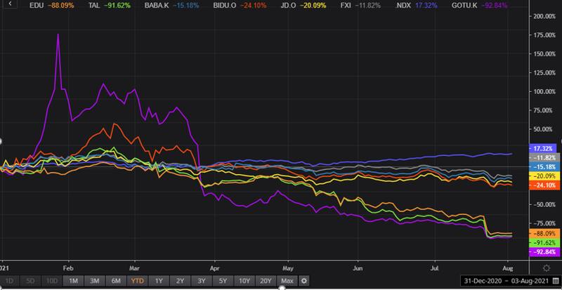 Las compañías de este sector, como New Oriental Education (EDU), Gaotu Techedu (GOTU) y TAL Education Group (TAL), perdieron más de la mitad de su valuación de mercado tras la medida, acumulando bajas que superan el 90% en lo que va del año en curso.