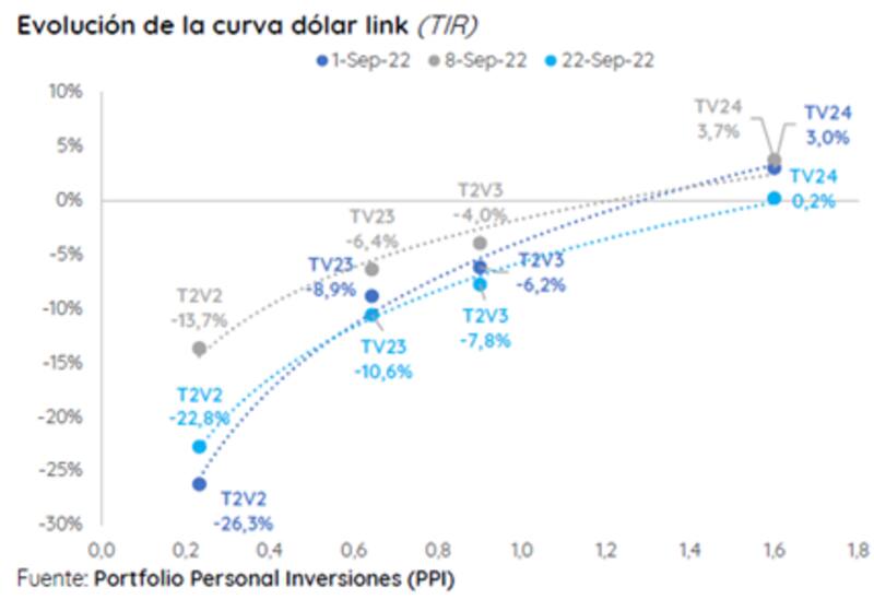 En la primera semana de septiembre, la curva de dólar linked operaba en niveles de -13,7% en el más tramo corto. Para 2023, los rendimientos se ubicaban entre -6,4% y -4% mientras que a 2024 las tasas estaban en +3,7% y +3%.