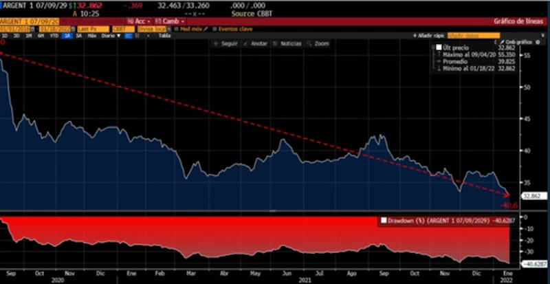 Desde que salieron a cotizar, los bonos emitidos por Guzmán acumulan una pérdida del 40%, con la probabilidad de default en 97% a 10 años y cerca del 80% de chances de ver un evento creditico en los próximos 4 años.