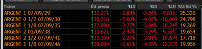 Tras el feriado de ayer en los Estados Unidos, todos los tramos de la curva argentina inician la semana en rojo. Dentro de la parte más corta, los Globales 2029 y 2030 caen 2,9% y 2,6% respectivamente. En el tramo medio, los Globales 2035 y 2038 retroceden 2,8% y 2,47% mientras que los vencimientos de mayor plazo, a 2041 y 2046, muestran rojos respectivos de 2,27% y 2,61%.