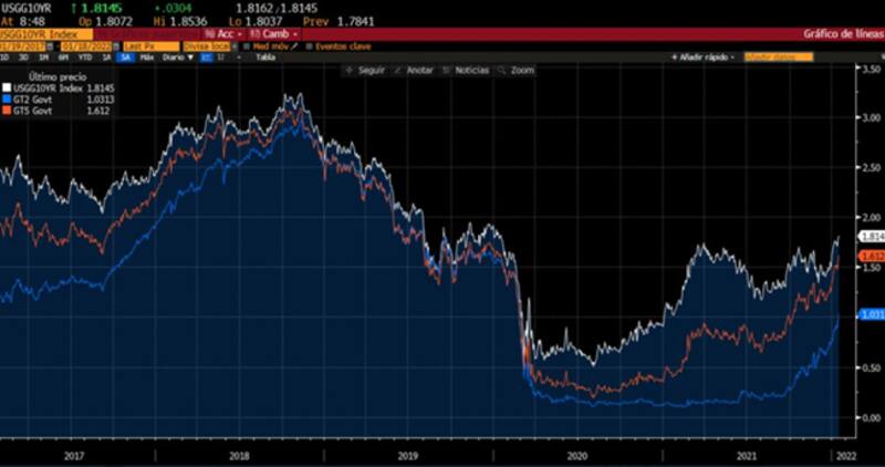Las tasas de los bonos del Tesoro escalaron con fuerza en la apertura del martes, con la tasa a 10 años colocándose por encima de 1,81%, la tasa a 5 años posicionándose por encima de 1,6% y los rendimientos a 2 años operando por encima del 1%.