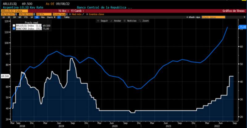 La inflación en Argentina está caminando al 71%. Debido a la actual aceleración inflacionaria, este año el BCRA inició un agudo ciclo contractivo en su política monetaria, pasando la tasa de Leliq desde el 38% al 69% actual.