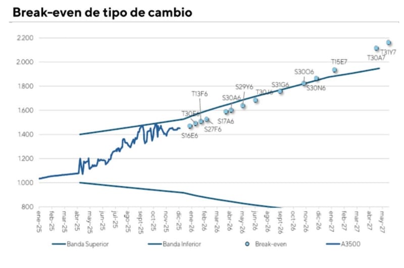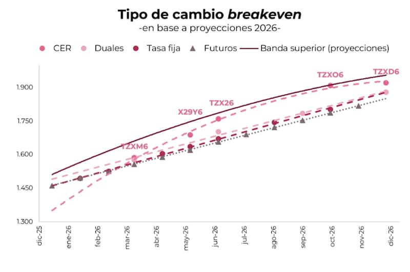 “Al analizar el tipo de cambio de equilibrio implícito para dicho escenario –esto es, el nivel que iguala el rendimiento de un Boncer con el de una posición en dólares– se observa que, a partir del tramo de junio de 2026, ese breakeven comienza a acercarse al techo de la banda cambiaria. Esto sugiere que los instrumentos CER no solo ofrecen cobertura frente a la inflación, sino que podrían resultar particularmente eficientes como estrategia de carry trade dentro del nuevo esquema cambiario”, comentaron.