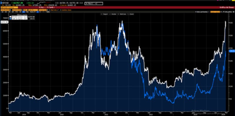 A su vez, el Bitcoin sube 57% en lo que va del año y ha regresado a máximos históricos.
