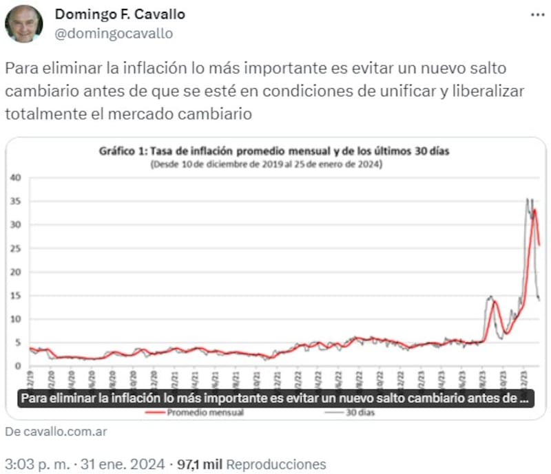 "Para eliminar la inflación lo más importante es evitar un nuevo salto cambiario antes de que se esté en condiciones de unificar y liberalizar totalmente el mercado cambiario", posteó Cavallo el miércoles pasado en su cuenta de X (antes, Twitter).