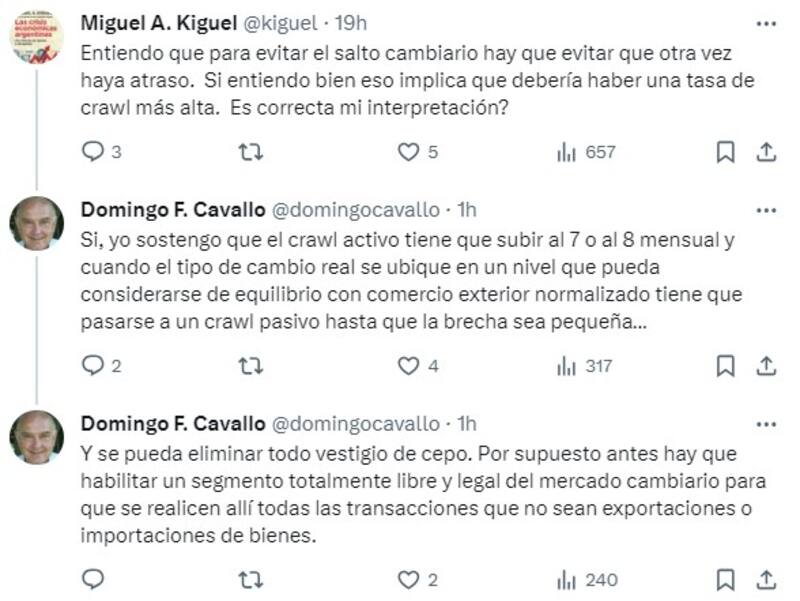 En respuesta al post, el economista y ex secretario de Finanzas Miguel Kiguel interpretó que para evitar otro salto cambiario habría que impedir que se genere nuevamente un atraso en la cotización del dólar oficial, por lo que se debería acelerar el ritmo del crawl (devaluación), lo que fue ratificado por Cavallo.
