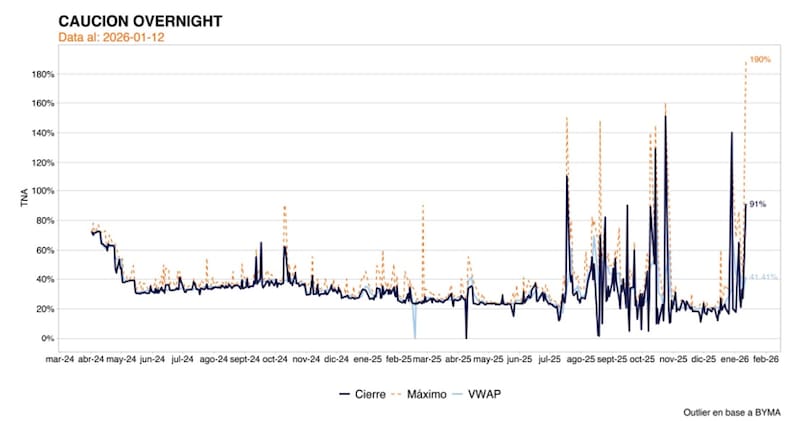 En particular, se observa un escenario de alta tensión y volatilidad en las cauciones aun día.