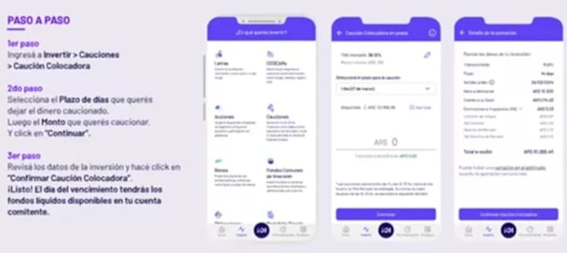 Una vez que tiene la cuenta comitente abierta, se transfieren los pesos. Desde que los pesos quedan depositados en la cuenta comitente, el inversor va a la sección de cauciones dentro de su aplicación o Web de la Alyc.