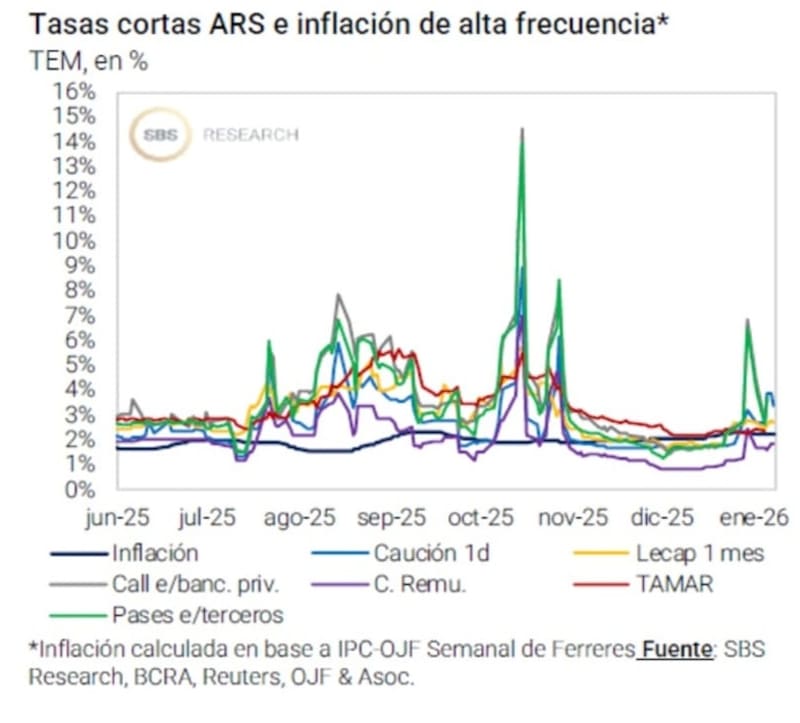 “En gran parte, esto podría estar explicado por la estacionalidad de la demanda de dinero al alza hacia fin de año (SAC, fiestas y vacaciones), lo que luego se revierte rotundamente en febrero y marzo. La mayor volatilidad se refleja en tasas bien cortas, como las interbancarias, para empresas, de caución, y de instrumentos del Tesoro más que nada tasa fija”, afirmó.