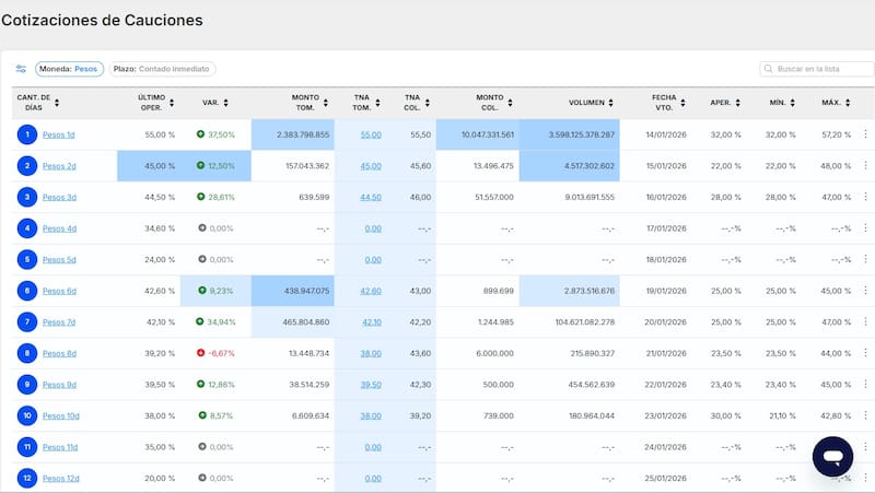 Hoy cotiza en 55% (TNA) en la caución a un día.