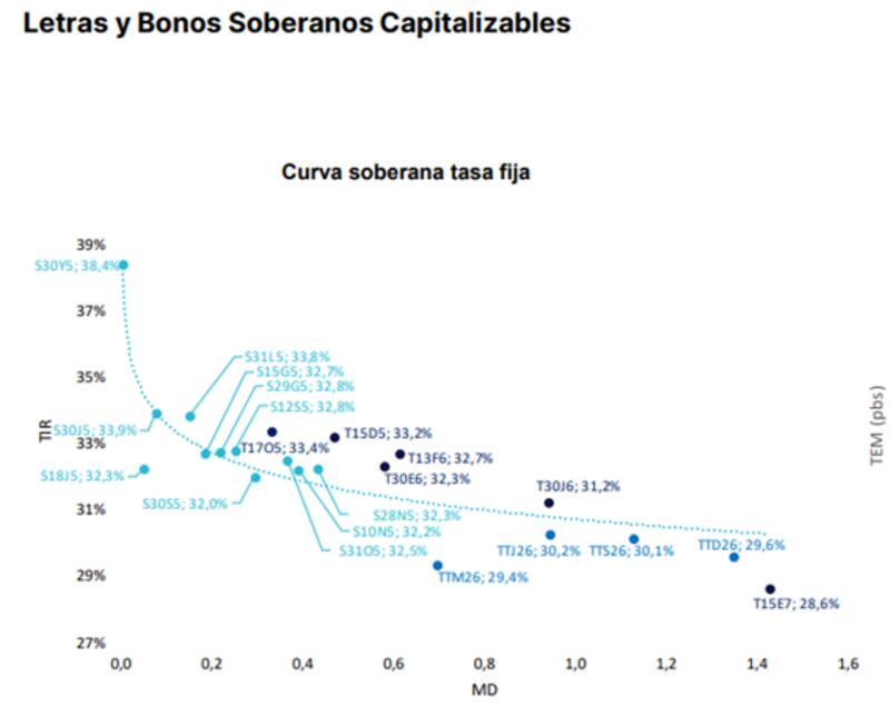 Además, la curva a tasa fija se torna negativa por lo que el mercado espera una menor nominalidad a mediano plazo. ¿Qué bonos prefiere el mercado para invertir en pesos a largo plazo?