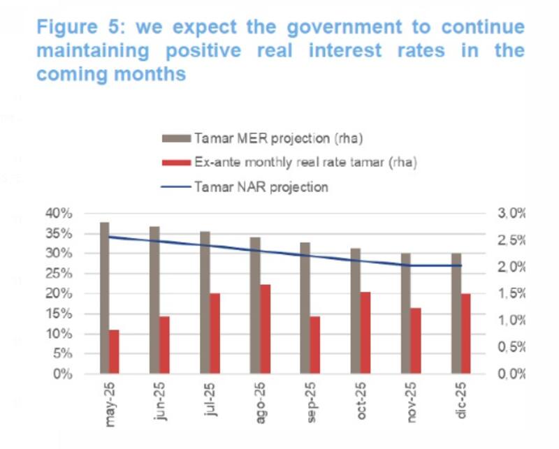 "Anticipamos que la disminución de las tasas implícitas de futuros del dólar, junto con el compromiso del gobierno de acelerar la desinflación, podría resultar en tasas de interés nominales más bajas y un tipo de cambio más fuerte. No obstante, esperamos que el gobierno mantenga tasas de interés reales positivas en los próximos meses. Proyectamos una disminución de la tasa nominal anual Tamar del 34% al 27% para finales de año. En este escenario, consideramos que TTJ26 es el más atractivo", indicaron.